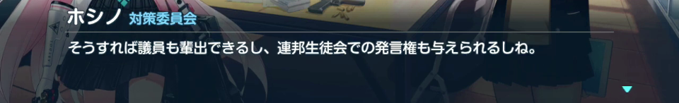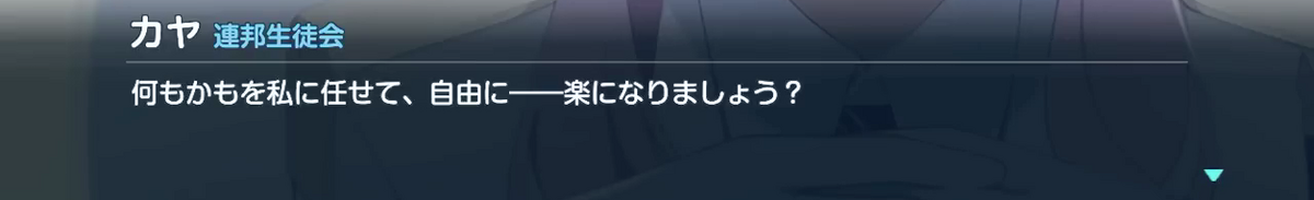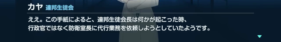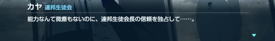 また、カヤが連邦生徒会長に羨望や尊敬に近い念を抱いているのを見ると、流石に会長の意志を捻じ曲げる事はしないのでは、という解釈も可能だ。