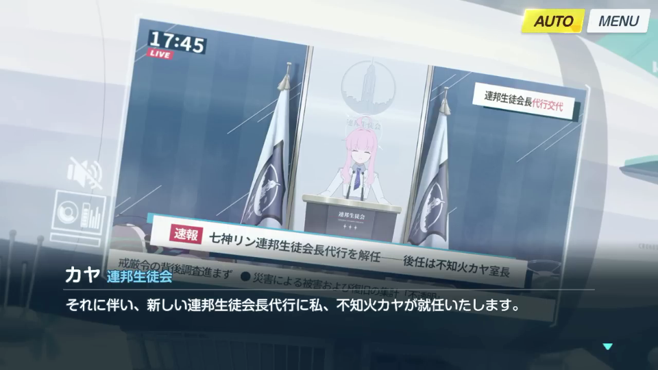 突如、連邦生徒会の緊急アラートが鳴り、緊急声明が発表される。声明の内容は、首席行政官であるリンの失脚と、新たな連邦生徒会長代行にカヤが就任するという内容だった。